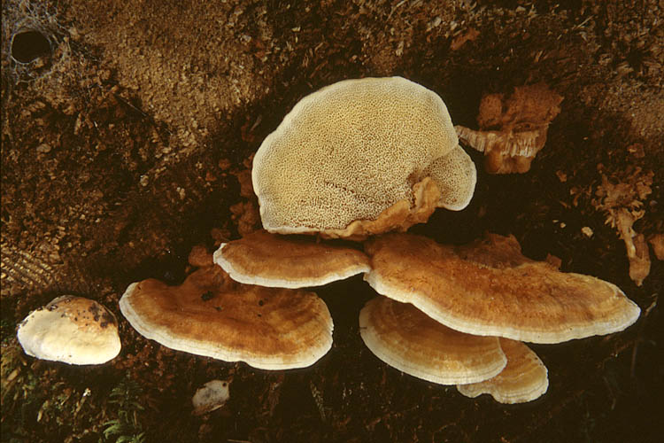 Face inférieure: porée, jaune ocre à jaune-brun en période de croissance; aux pores fins, ronds ou anguleux, 3-6 par mm; aux tubes constitués d'une à trois couches superposées d'environ 1 mm chacune.
