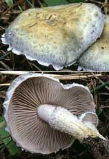 Lames: adnées ou décurrentes en filet, larges, serrées à subespacées, crème au début, puis jaune-gris pâle, finalement grises de plus en plus foncées et souvent avec une nuance violacée, jaune pâle à l'arête.