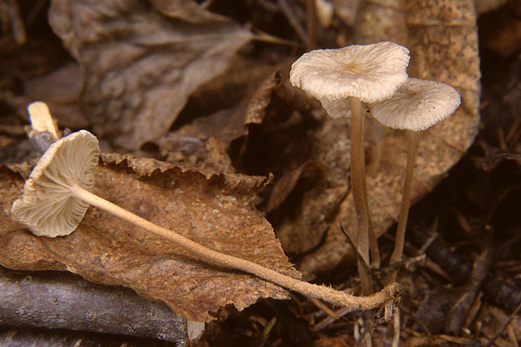 Pied: 1,5-3 cm de long par 0,2-0,3 mm de diamètre, filiforme, rigide, blanchâtre ou crème tout près des lames, brun rougeâtre à brun noirâtre plus bas.