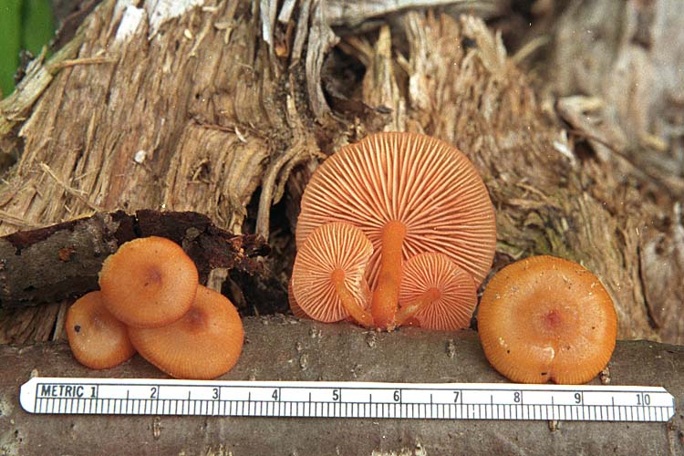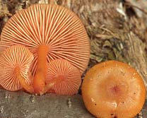 Lames: adnées, assez larges, serrées à subespacées, à nombreuses lamellules intercalées, orange à orange rosé, bordées à l'arête d'un liséré rouge orangé.
