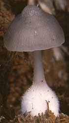 Pied: 3-6 cm de long par 1-2 mm de diamètre, égal, cylindrique, tubuleux (creux), très fragile, recouvert d'une pruine blanche au début, blanchâtre au sommet, de plus en plus gris brun vers le bas, la base parfois entourée de poils ou de mycélium blancs.