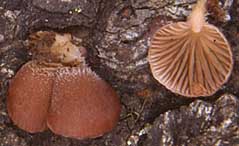 Pied: rudimentaire, latéral, 1-3 mm de long par 1,5-2 mm de diamètre mais courant parfois jusqu'à 7 mm sous l'écorce, tomenteux blanchâtre ou concolore au chapeau.