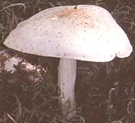 Chapeau: 3,5-10 cm de diamètre, convexe, puis convexe-étalé, parfois un peu mamelonné; à surface lisse, mate, blanche à blanc crème, tachée ou ponctuée de roux, particulièrement vers le centre; à marge incurvée au début, puis étalée; à chair ferme, blanche, à odeur non distinctive, à saveur d'abord douce puis un peu amère.